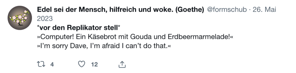 Denn vielleicht entdecken wir ja auch ganz famose neue Lebensmittel, Zutaten und Gerichte aus Pflanzen, vielleicht auch aus Algen, Mikroorganismen, Flechten, Moosen oder Pilzen, die uns so gut schmecken werden, dass wir in ein paar Jahrzehnten (oder Jahrhunderten, wenn es uns gelingt, den Klimawandel zivilisiert zu überstehen) Fleisch gar nicht mehr nachtrauern werden. Die Alten, die es noch kennen, werden allmählich weniger und die Jungen, die ohne Fleisch aufwachsen, werden nach und nach zur Mehrheit. Dann gäbe es weitere Piktogramme, die man jungen Menschen erstmal erklären müsste, weil sie die Dinge dahinter aus ihrem eigenen Leben weder kennen noch vermissen.